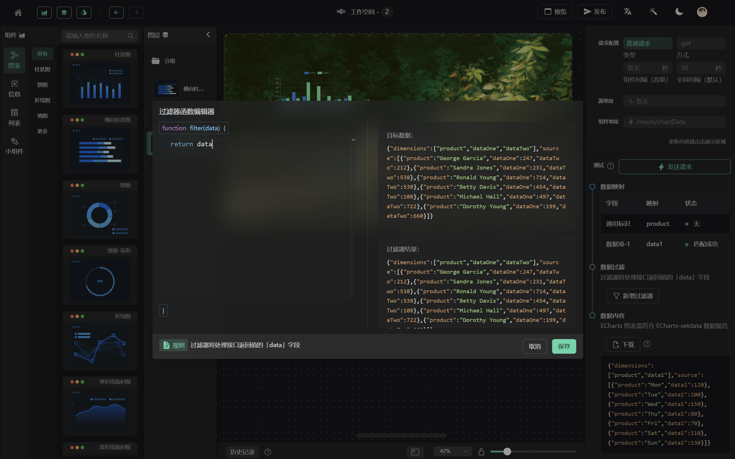 • 可视化:基于开源图表库EChartsVChart 编写,具有丰富的图表类型和适配大屏的主题效果;
